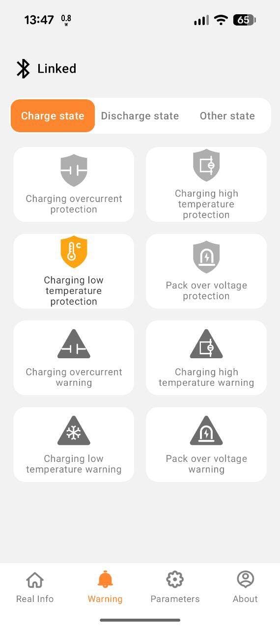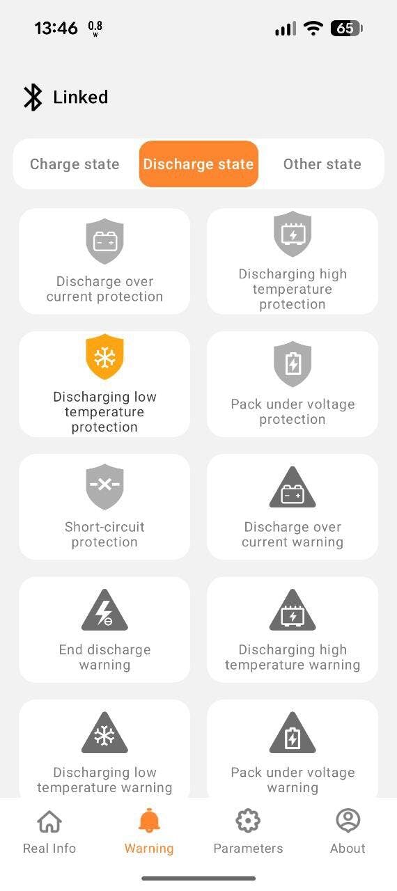 Another issue I experienced with both batteries was related to low temperature discharge cut off. There are two low temperature cut off settings, one for charging and the other for discharging. The low temperature cut off for charging works correct, but the low temperature cut off for discharge does not. When the battery temperature falls below the charge cut off set point, the battery also also disables discharge (despite a lower discharge cutoff set point). This effectively means you can't discharge these batteries below freezing.