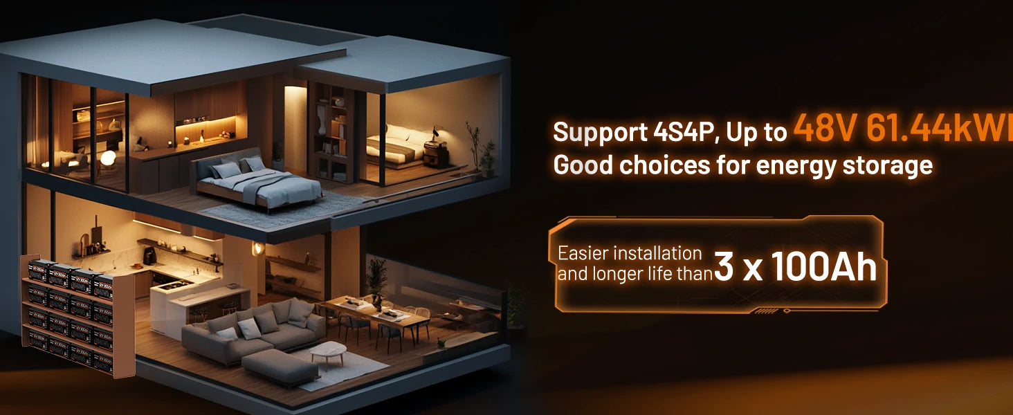 • Series or Parallel Connection: Easily connect up to 4 batteries in series or parallel, achieving a total capacity of up to 40.96kWh. Customize your power solution to suit your needs.